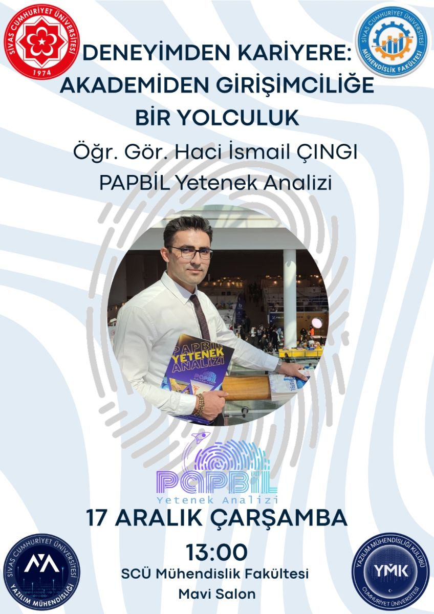 Öğrencilerimizin kariyer planlamalarına rehberlik etmek amacıyla düzenlenen bu etkinlikte, Öğr. Gör. Hacı İsmail ÇINGI, akademik ve girişimcilik alanlarında edindiği deneyimleri öğrencilerimizle paylaşacaktır. Etkinlikte, girişimcilik sürecine ilişkin farklı deneyimlerin yanı sıra PAPBİL Yetenek Analizi kapsamında yürütülen çalışmalar da ele alınacaktır.